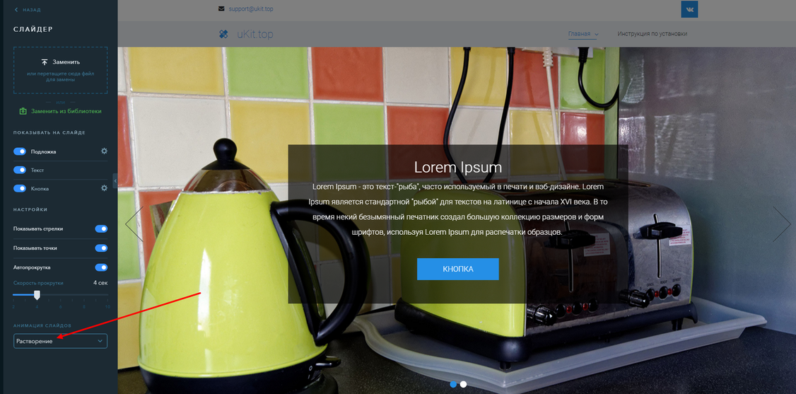 В настройках параметра слайдера — (анимация слайдов) установите пункт «растворение»